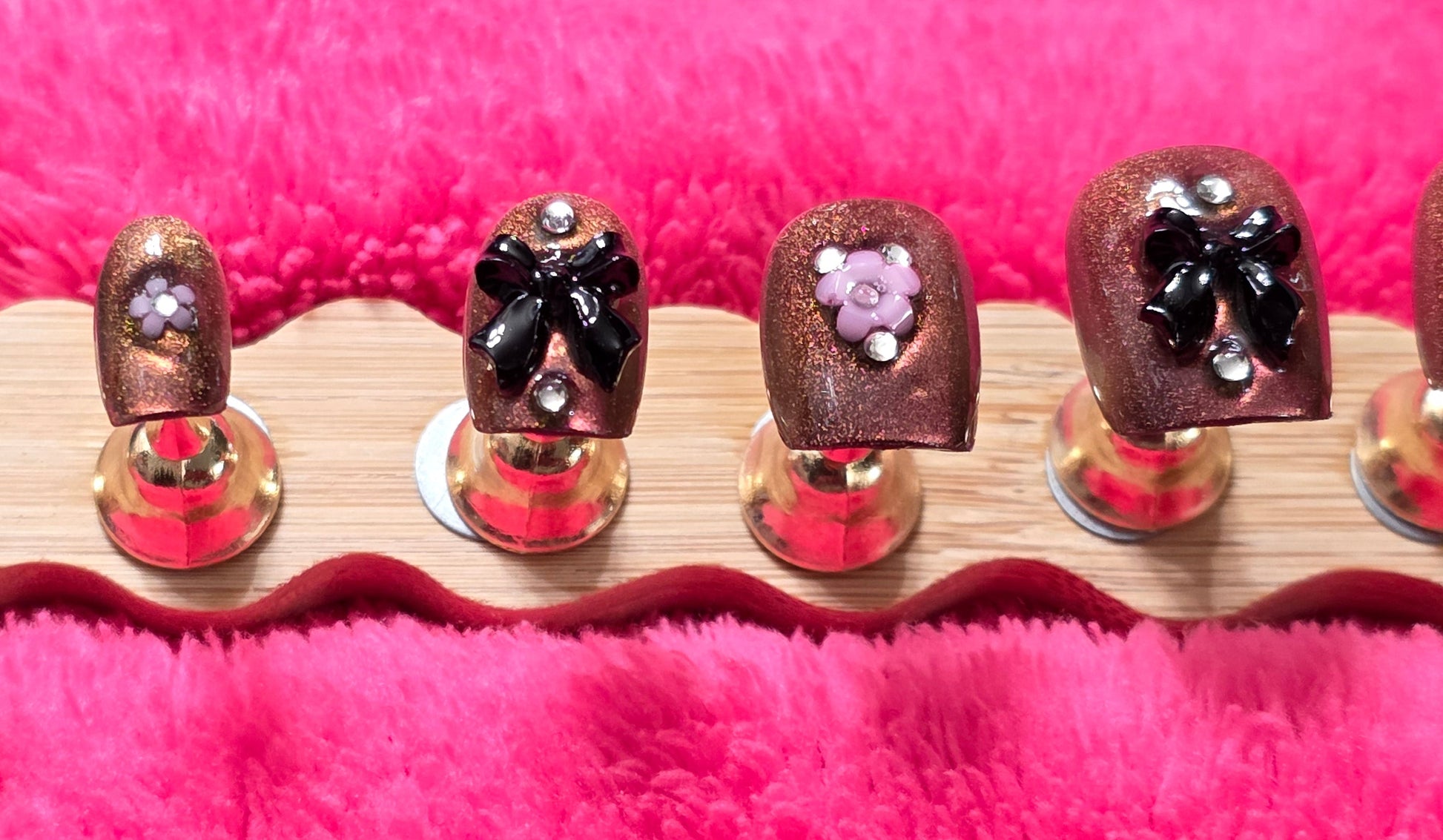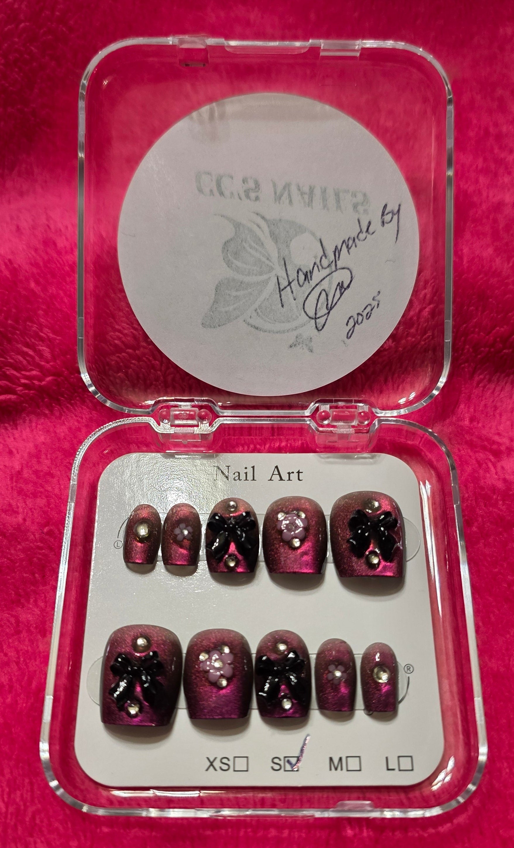 COLOR: PURPLE CATEYE NAILS WITH BLACK AND PINK EMBELLISHMENTS