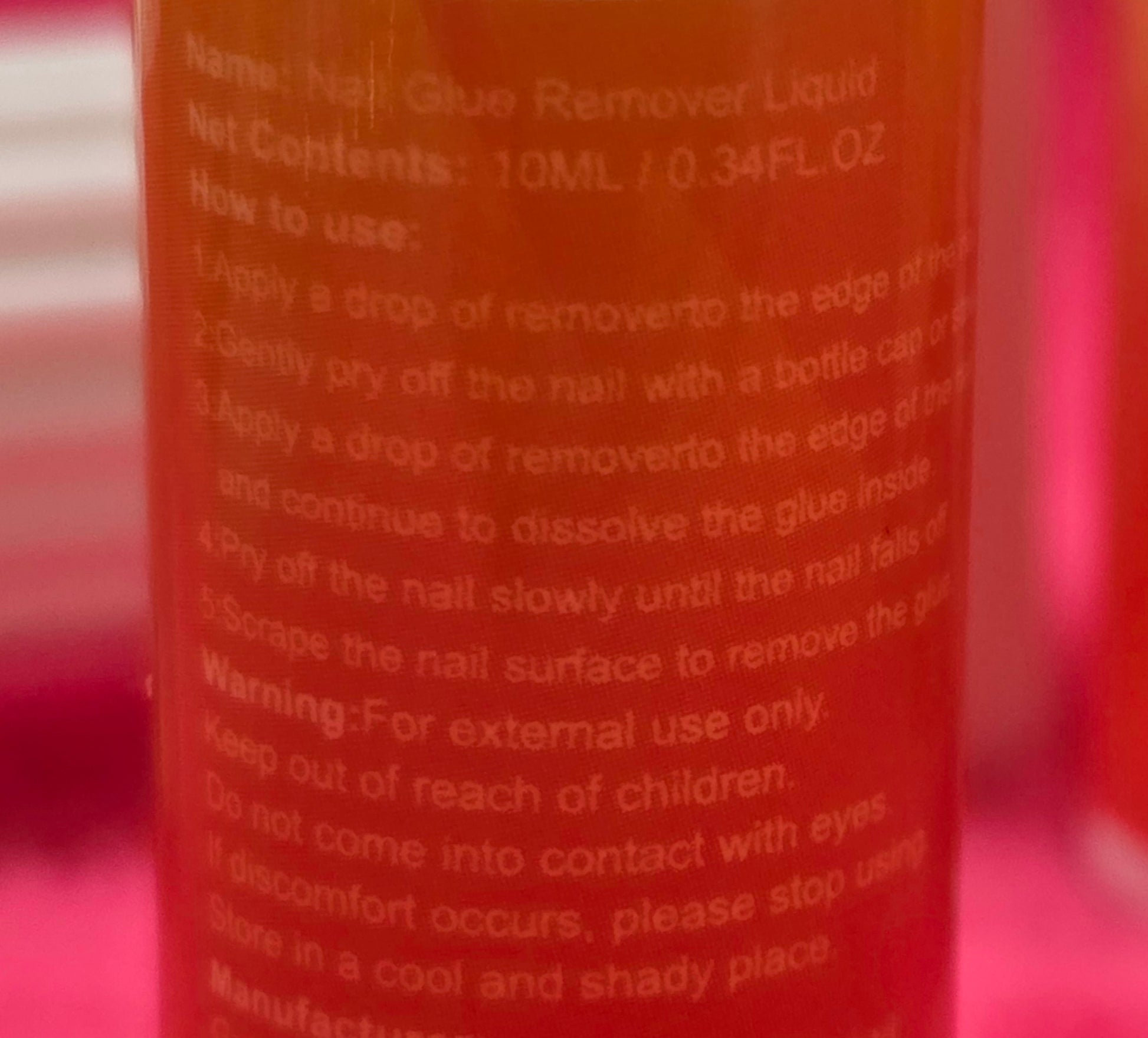 Press on nail, glue and adhesive remover, saves nails and removes fake nails pain free. No damage to real nails leaves behind no residue, read directions before use.